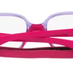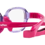 A armação é totalmente confeccionada em material flexível e resistente (BPA Free), eliminando parafusos e partes metálicas, o que a torna segura e praticamente inquebrável, perfeita para brincadeiras e esportes. O design moderno e anatômico apresenta uma armação em tom roxo translúcido, complementada por hastes em um vibrante tom de rosa, criando um visual alegre e cativante para as crianças.