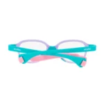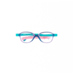 A armação é totalmente confeccionada em material flexível e resistente (BPA Free), eliminando parafusos e partes metálicas, o que a torna segura e praticamente inquebrável. Ideal para brincadeiras, esportes e o dia a dia agitado, esta estrutura assegura que os óculos resistam aos desafios infantis. O design moderno apresenta uma armação em tom lilás translúcido, complementada por hastes em um vibrante tom de turquesa (azul-água), criando um visual divertido e cativante para as crianças.