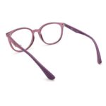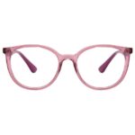 A armação em acetato, com um charmoso formato redondo (ou panto), apresenta um vibrante tom rosa translúcido (código de cor 3827), que confere um visual leve, alegre e cheio de personalidade. As linhas suaves e a transparência do material destacam o rosto de forma delicada.