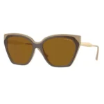 A armação de formato gatinho (ou borboleta) apresenta um estilo ousado, com um design de duas cores: a parte superior em tom bege claro translúcido e a parte inferior em marrom escuro sólido, criando um contraste visual elegante e moderno. As lentes em marrom sólido (código de cor 310183) complementam perfeitamente a armação, garantindo uma estética coesa. O “Vogue P” na lente indica que são lentes polarizadas, oferecendo redução superior de brilho e maior clareza visual, ideal para diversas condições de luz.